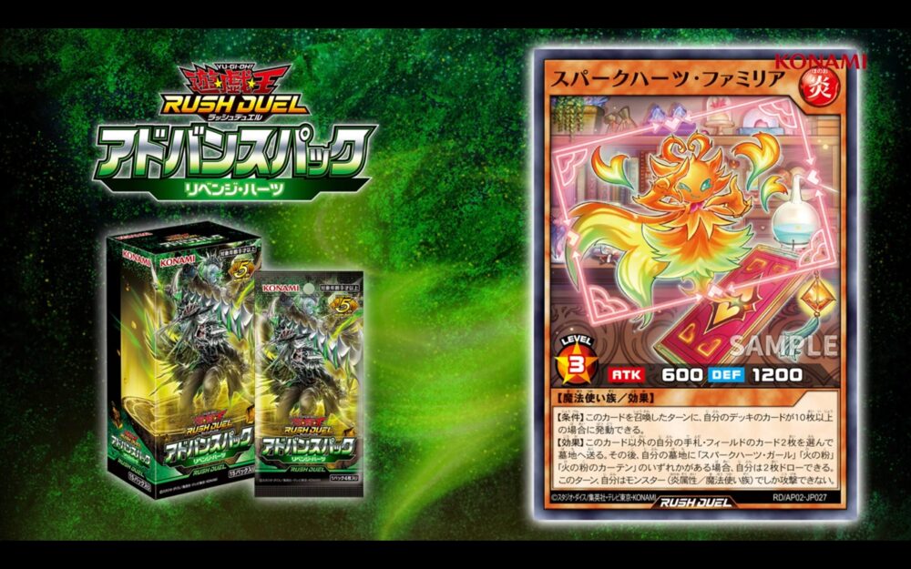 2026/1/10に発売される遊戯王ラッシュデュエルのスペシャルパック「アドバンスパック リベンジ・ハーツ」収録の『スパークハーツ・ファミリア』が公開されました。