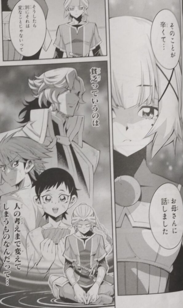 - 驚いた表情を浮かべるレグルスに田舎に6歳の妹たちと長患いの母がいること、父が炭鉱で事故に合って亡くなったことを告げる。