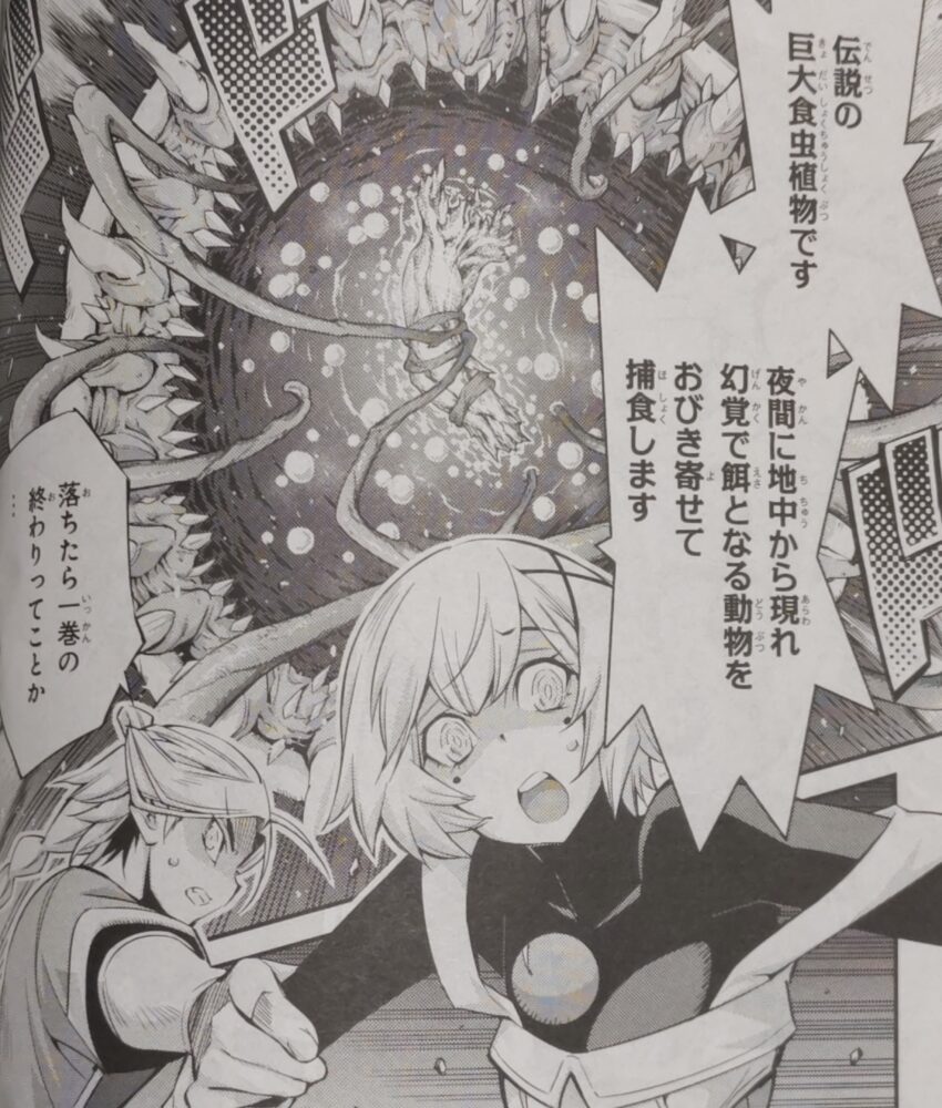 - その穴はガードルネペンテスという伝説の巨大食虫植物が空けたもので、幻覚で獲物をおびき寄せて捕食するとシードは説明する。