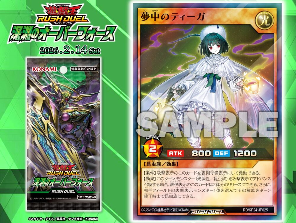 2026/2/14に発売の遊戯王ラッシュデュエルの基本パック「深淵のオーバーフォース」に収録される『夢中のティーガ(むちゅう)』の設定画が公開されました。