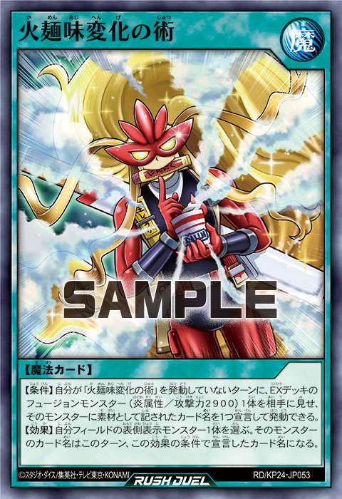 【効果】自分のデッキの上からカード2枚を墓地へ送る。その後、自分の墓地の通常モンスター(炎族)1体または「火麺味変化の術」1枚を選んで手札に加える事ができる。