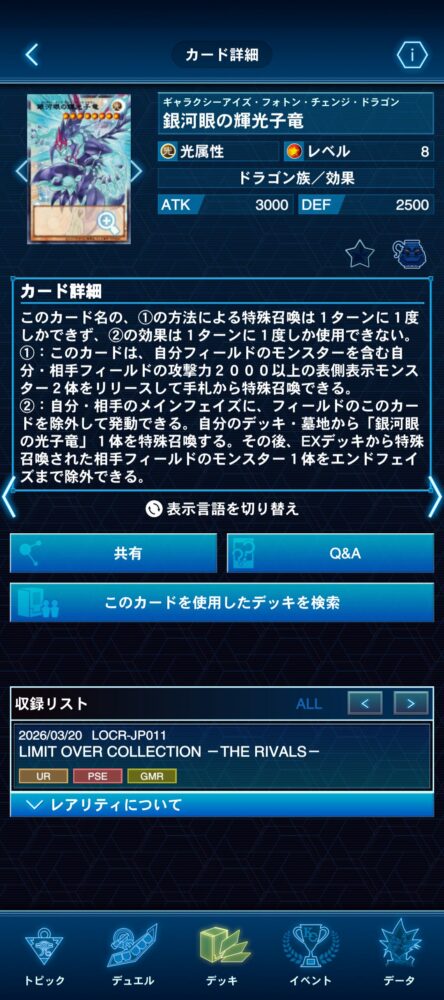 - LOCR-JP011『銀河眼の輝光子竜』 ウルトラレア ※オーバーフレームカードあり ※グランドマスターレア仕様あり
