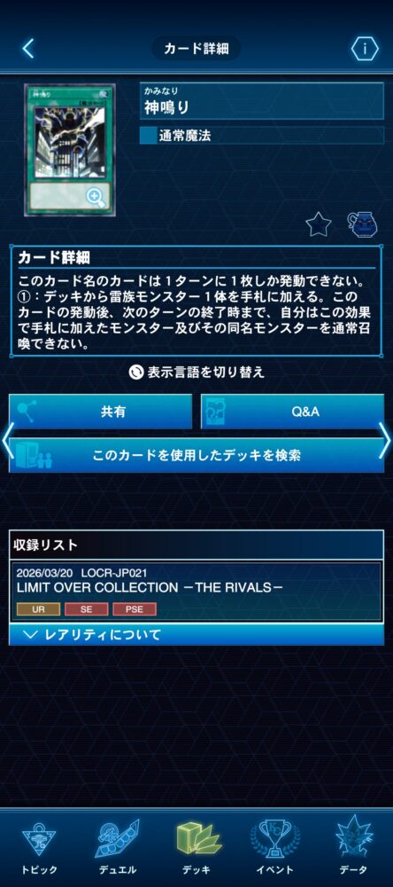 そして、未OCGカードからの実装では雷族の強力な汎用サーチ札である『神鳴り』も登場。