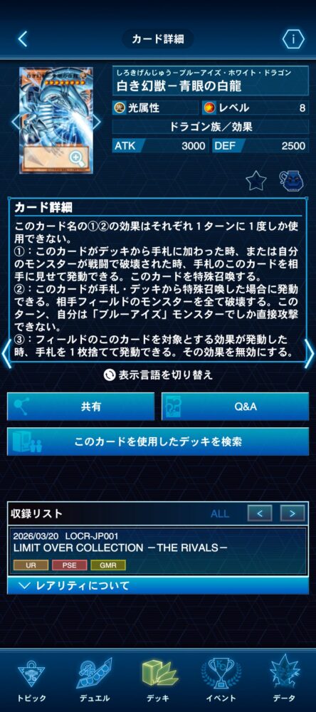 - LOCR-JP001『白き幻獣-青眼の白龍』 ウルトラレア ※オーバーフレームカードあり ※グランドマスターレア仕様あり
