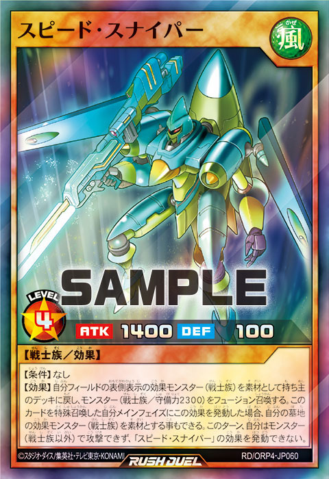 【効果】自分フィールドの表側表示の効果モンスター(戦士族)を素材として持ち主のデッキに戻し、モンスター(戦士族/守備力2300)をフュージョン召喚する。このカードを特殊召喚した自分メインフェイズにこの効果を発動した場合、自分の墓地の効果モンスター(戦士族)を素材とする事もできる。このターン、自分はモンスター(戦士族以外)で攻撃できず、「スピード・スナイパー」の効果を発動できない。