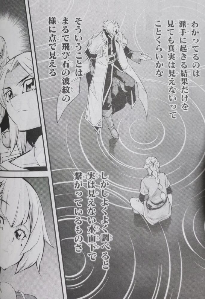 - それに対しアポッソは「さあ…」と前置きしつつ「派手に起きる結果だけを見ても真実は見えない」「しかし、よくよく調べると実は見えない水面下で繋がっているものさ」と返す。