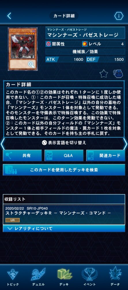 ①:このカードをリリースし、手札の機械族モンスター1体を相手に見せて発動できる。見せたモンスターとは属性が異なる機械族モンスター1体をデッキから手札に加える。この効果で攻撃力1200以下のモンスターを手札に加えた場合、さらに手札から機械族モンスター1体を特殊召喚できる。
