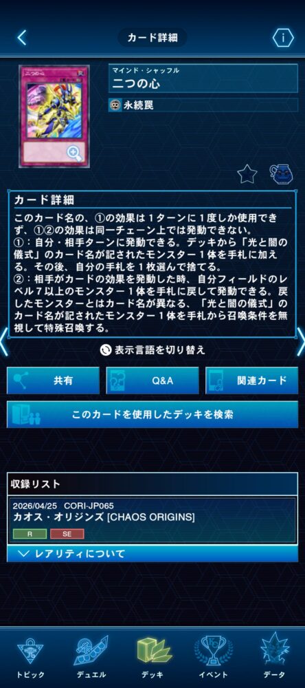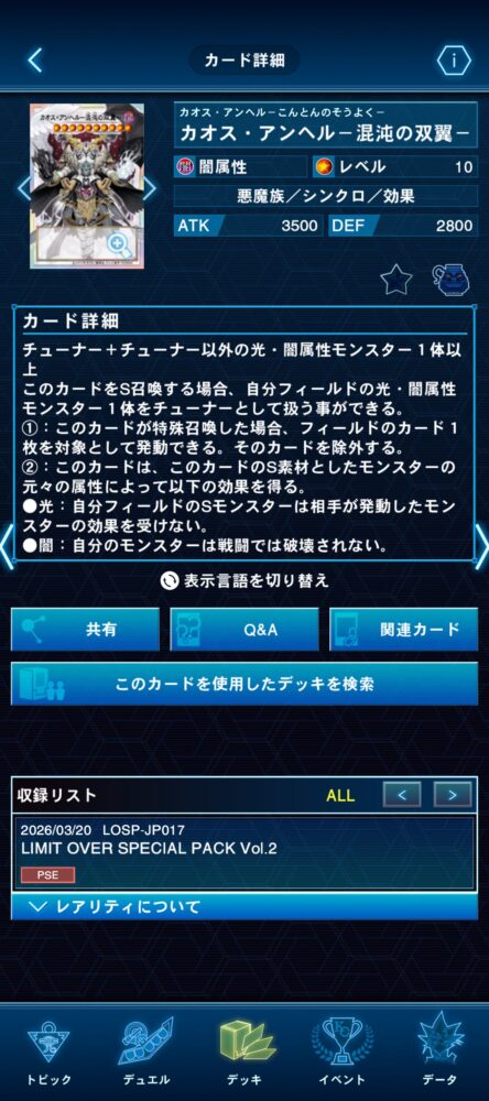 それと、パック名や『カオス・アンヘル-混沌の双翼-』のオーバーフレームカードが登場したことから新規カード追加が濃厚だろうと予想していたシンクロ召喚軸「カオス」も、結局は来ずでした。