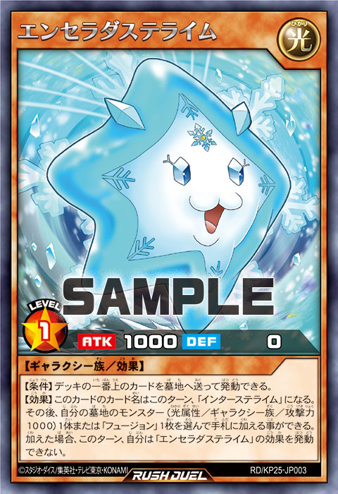 【効果】このカードのカード名はこのターン、「インターステライム」になる。その後、自分の墓地のモンスター(光属性/ギャラクシー族/攻撃力1000)1体または「フュージョン」1枚を選んで手札に加える事ができる。加えた場合、このターン、自分は「エンセラダステライム」の効果を発動できない。
