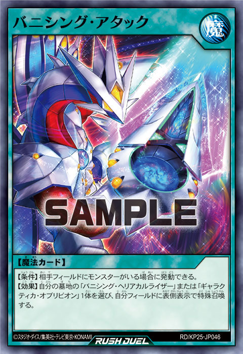 【効果】このターン、モンスター(光属性/ギャラクシー族)を攻撃表示でアドバンス召喚する場合、表側表示のこのカードは2体分のリリースにできる。さらに、自分の墓地の「ギャラクティカ・オブリビオン」または「バニシング・ヘリアカルライザー」1体を選んで手札に加える事ができる。