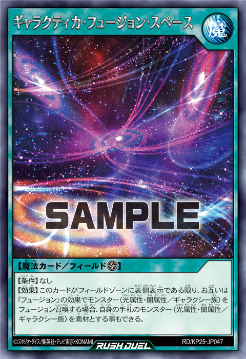【効果】このカードがフィールドゾーンに表側表示である限り、お互いは「フュージョン」の効果でモンスター(光属性・闇属性/ギャラクシー族)をフュージョン召喚する場合、自身の手札のモンスター(光属性・闇属性/ギャラクシー族)を素材とする事もできる。