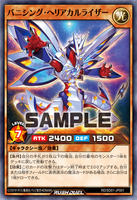 【効果】このカードのカード名はこのターン、「バニシング・ヘリアカルライザー」になる。その後、自分の墓地のモンスター(レベル7/ギャラクシー族)1体を選んで自分フィールドに表側表示で特殊召喚できる。このターン、自分は「リザレクション・ヘリアカルライザー」の効果を発動できない。