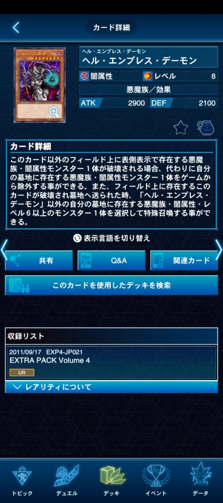 ②:自分・相手のスタンバイフェイズに、自分のEXデッキに表側の「デス・エンペラー・デーモン」が存在する場合に発動できる。墓地・除外状態のこのカードを手札に加える。