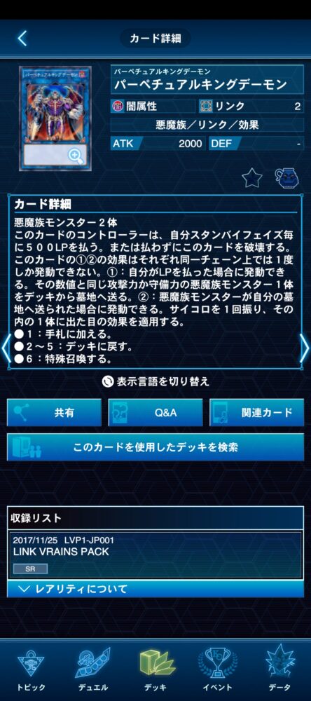 ①:手札・フィールドのこのカードをリリースして発動できる。デッキから「ロワイヤル・デーモン」以外の「デーモン」カード1枚を手札に加える。このターン、自分は「デーモン」モンスターしかEXデッキから特殊召喚できず、通常召喚に加えて1度だけ、自分メインフェイズに悪魔族モンスター1体を召喚できる。