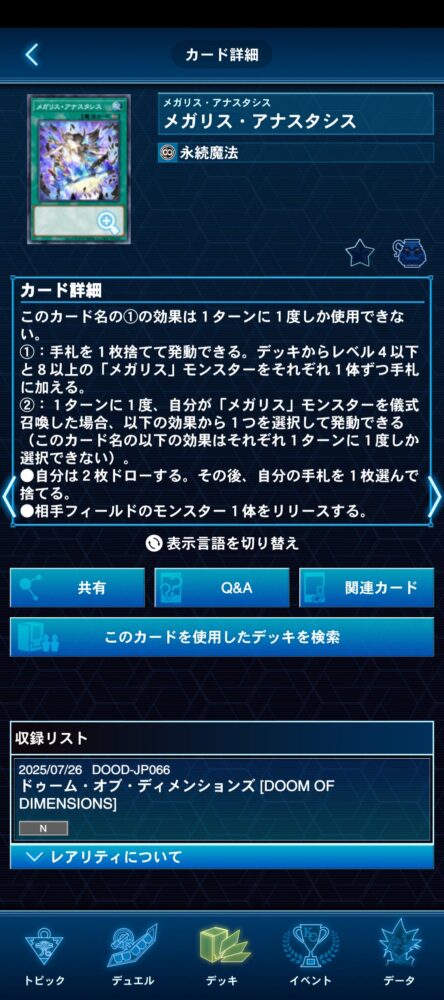 前弾の『メガリス・アナスタシス』を彷彿とさせるサーチ & 手札交換効果ですが、こちらはサーチが先に行われるため、あちらと異なりサーチしたモンスターも捨てられますね!!