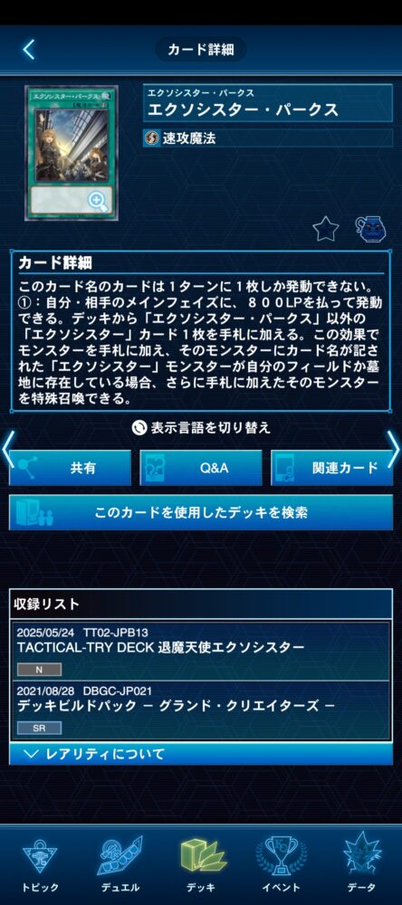墓地効果持ちなどが存在しないので捨てるカードは悩ましいものの、『エクソシスター・パークス』の追加効果で参照する位はできるでしょう。