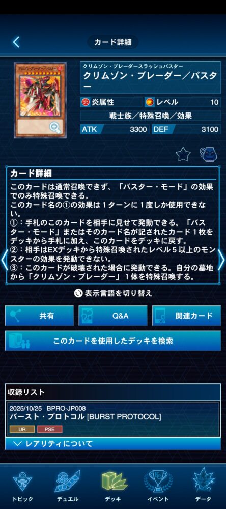 ②:自分の「/バスター」モンスターか「レッド・デーモンズ・ドラゴン」が攻撃したダメージステップ終了時、墓地のこのカードを除外して発動できる。その攻撃モンスターはもう1度だけ続けて攻撃できる。