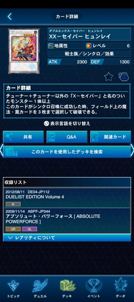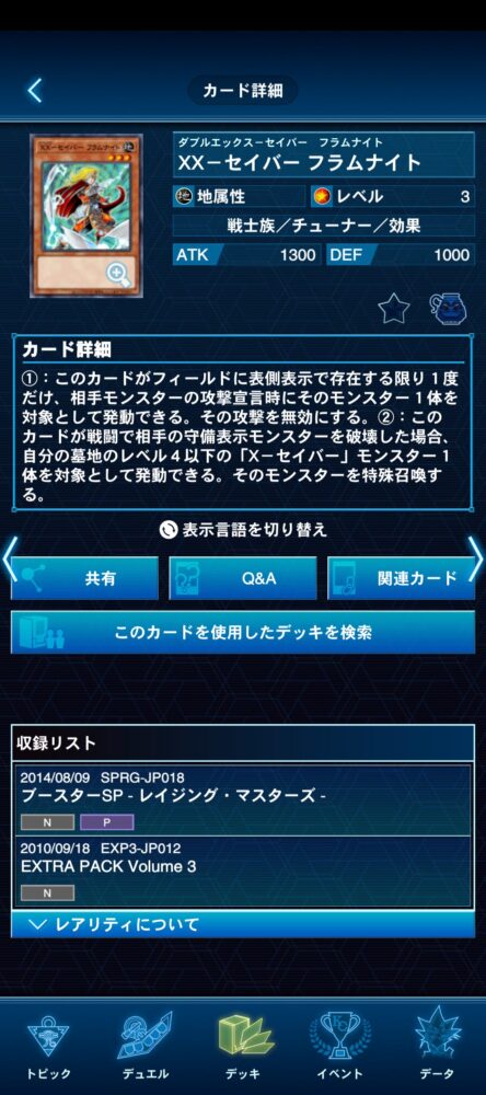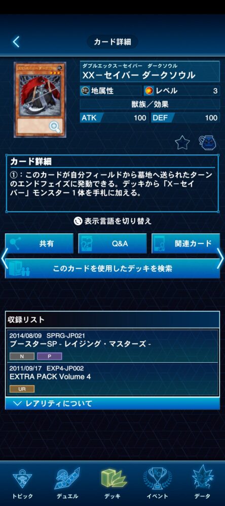 カード名とイラストが明らかに地属性ではない『XX-セイバー ダークソウル』のサーチがエンドフェイズと遅いため、そのフォローも多少はこなせるかな?