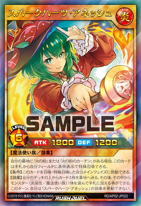 【効果】自分のデッキの上からカード3枚を墓地へ送る。その後、その中からモンスター(炎属性/魔法使い族)1体を選んで手札に加える事ができる。このターン、自分は「スパークハーツ・アネッシュ」の効果を発動できない。