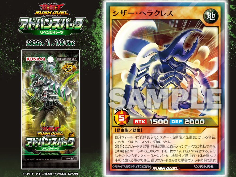 2026/1/10に発売される遊戯王ラッシュデュエルのスペシャルパック「アドバンスパック リベンジ・ハーツ」収録の『シザー・ヘラクレス』が公開されました。