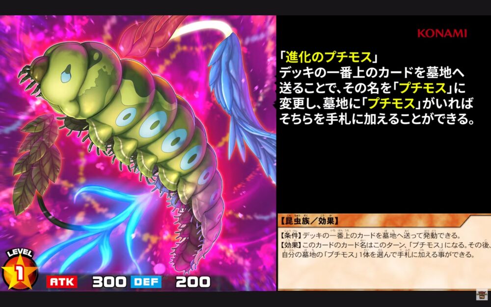 また、『プチモス』扱いになる下級モンスターも無事に追加され『蛹化するラーバモス』のコンタクトフュージョンや『グレート・モス』の特殊召喚も容易になりましたね。