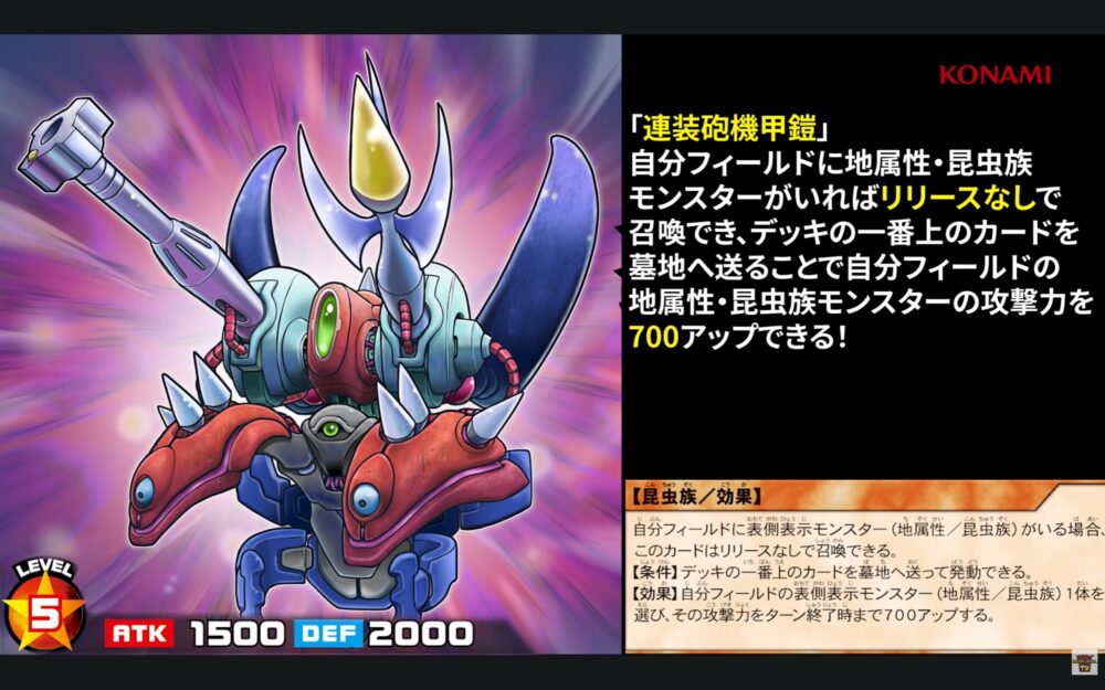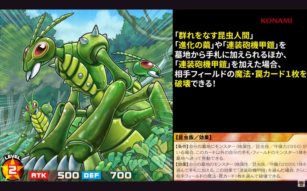 一応、テーマ内でも魔法・罠カードに関しては新規の『群れをなす昆虫人間』と『連装砲機甲鎧』を組み合わせることで除去が狙えます。『昆虫人間』、イラストのタッチめちゃくちゃ変わったな……。