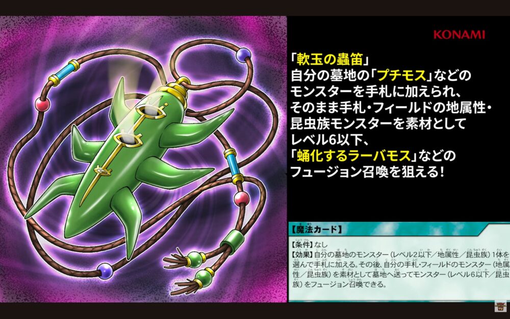 以前からイラストとカード名が判明していた『相変異態・グレート・モス』は、予想していた通り素材指定の緩いフュージョンモンスターでしたね。