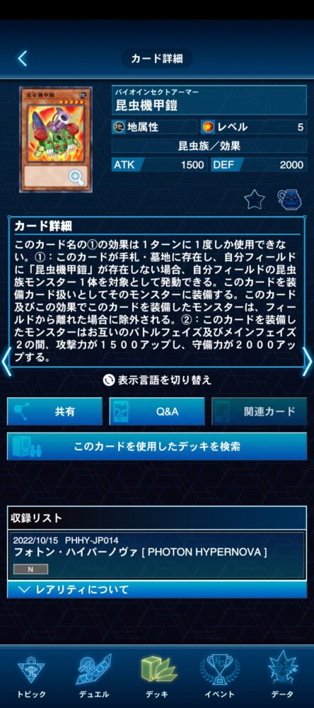 【効果】自分フィールドのモンスター1体を選んで墓地へ送る。その後、自分の墓地の効果モンスター(レベル6~8/地属性/昆虫族)1体を選んで自分フィールドに表側表示で特殊召喚できる。