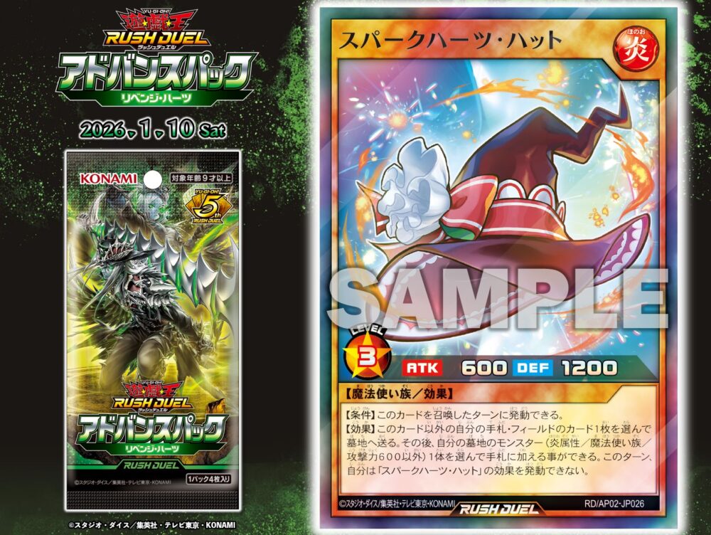 2026/1/10に発売される遊戯王ラッシュデュエルのスペシャルパック「アドバンスパック リベンジ・ハーツ」収録のスパークハーツ・ハット』が公開されました。