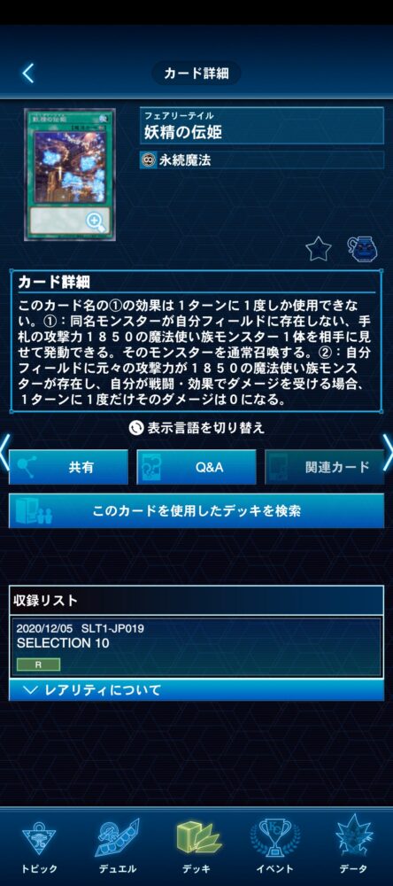 ①:このカードの発動時の効果処理として、自分のデッキ・除外状態の「妖精伝姫」モンスター1体か「妖精の伝姫」1枚を手札に加える事ができる。