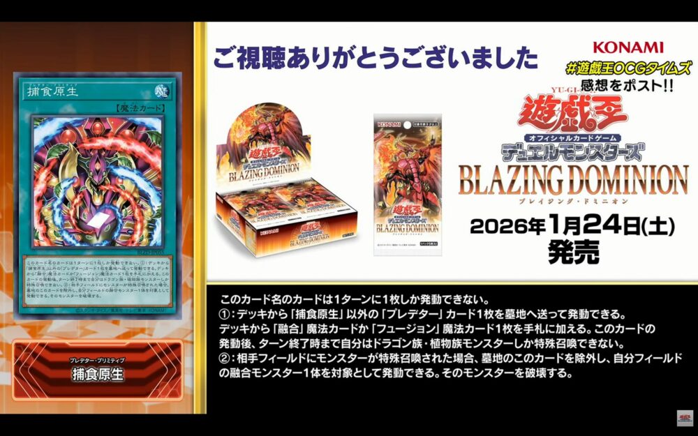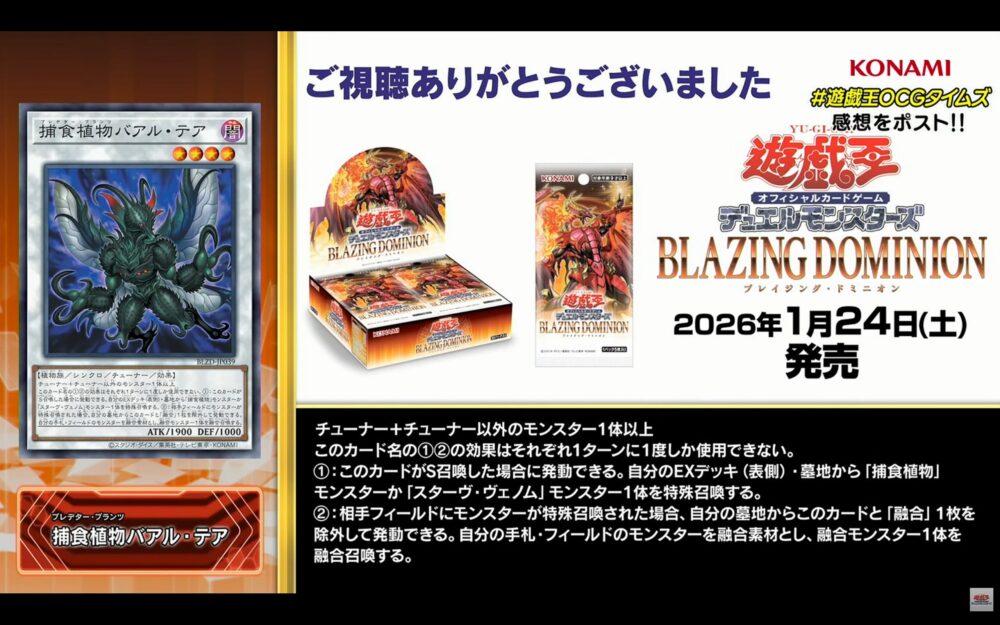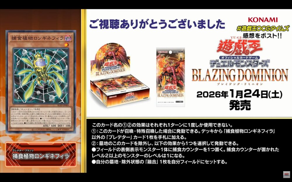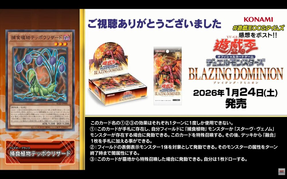 2026/1/24に発売される遊戯王OCGの基本パック「ブレイジング・ドミニオン(BLAZING DOMINION)」に収録される、「捕食植物(プレデター・プランツ)」関連カード6種が公開されました。