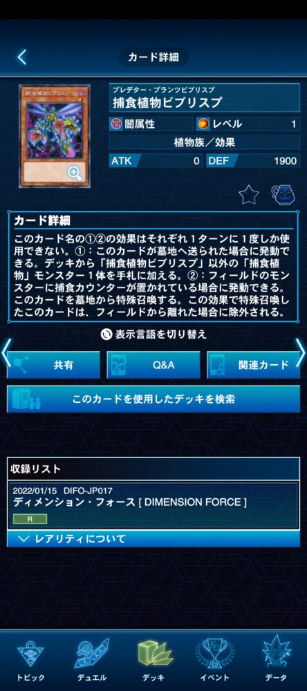 後者はデッキの「プレデター」カードを墓地に送ることもできるため、『捕食植物ビブリスプ』のサーチを筆頭に多くの有用な効果へと繋げることが可能。