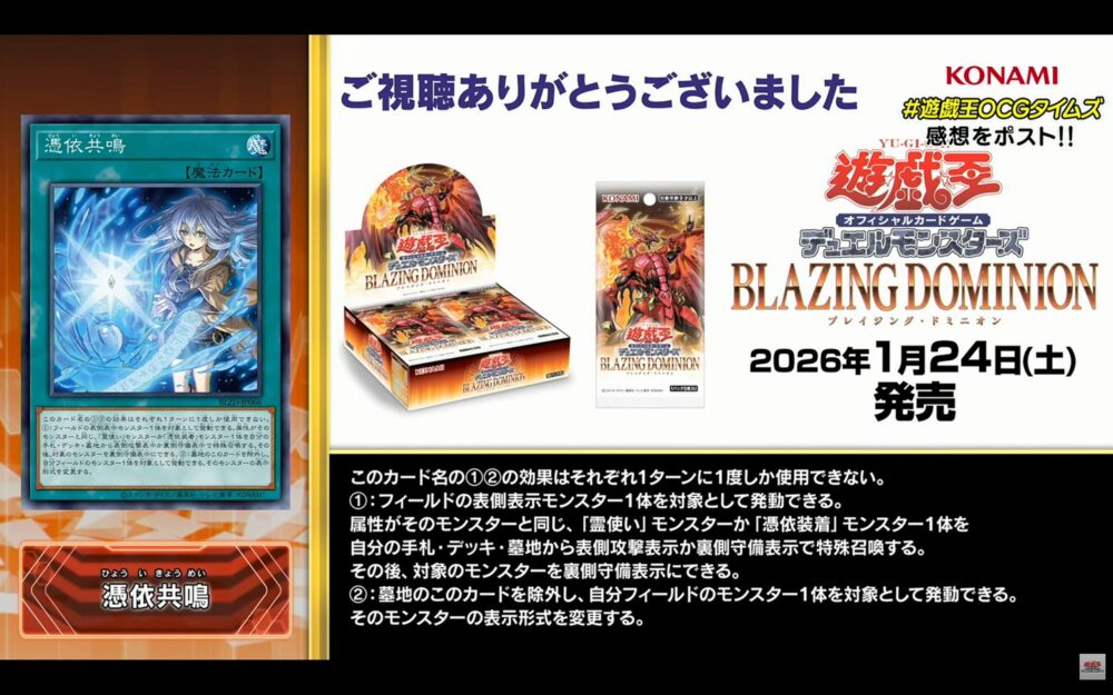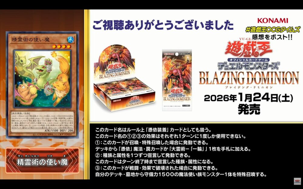 2026/1/24に発売される遊戯王OCGの基本パック「ブレイジング・ドミニオン(BLAZING DOMINION)」に収録される、「霊使い(れいつか)」関連カード3種が公開されました。