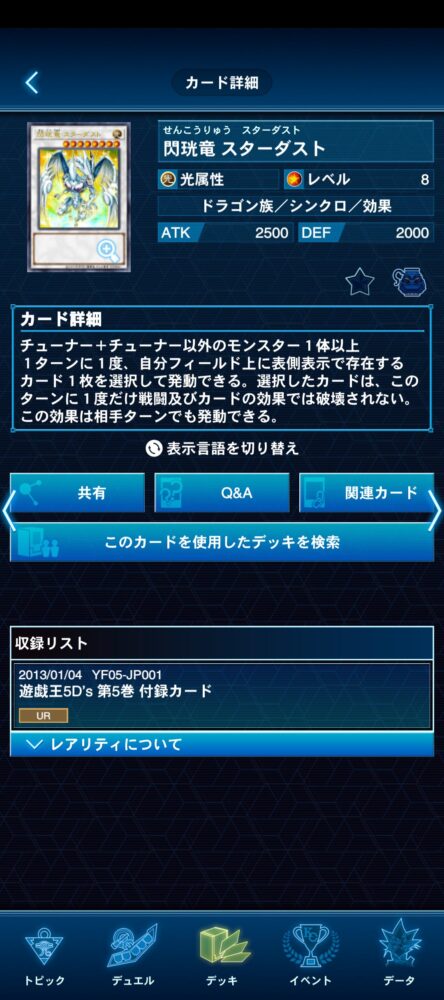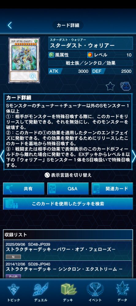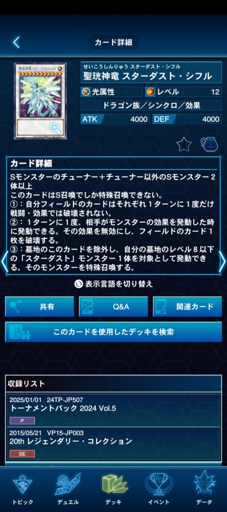 場持ちに優れた『聖珖神竜 スターダスト・シフル』や『真閃珖竜 スターダスト・クロニクル』がシンクロ召喚でしか特殊召喚できないの、ここに来てかなり惜しくなりました……。