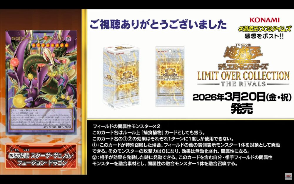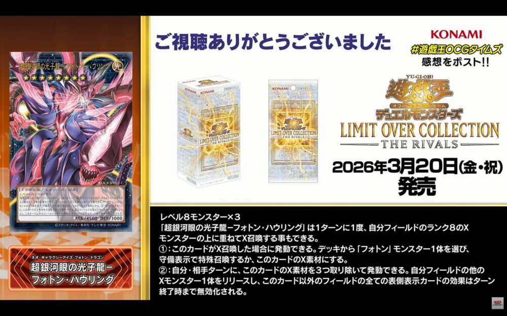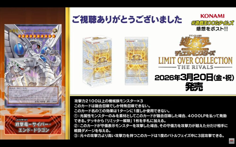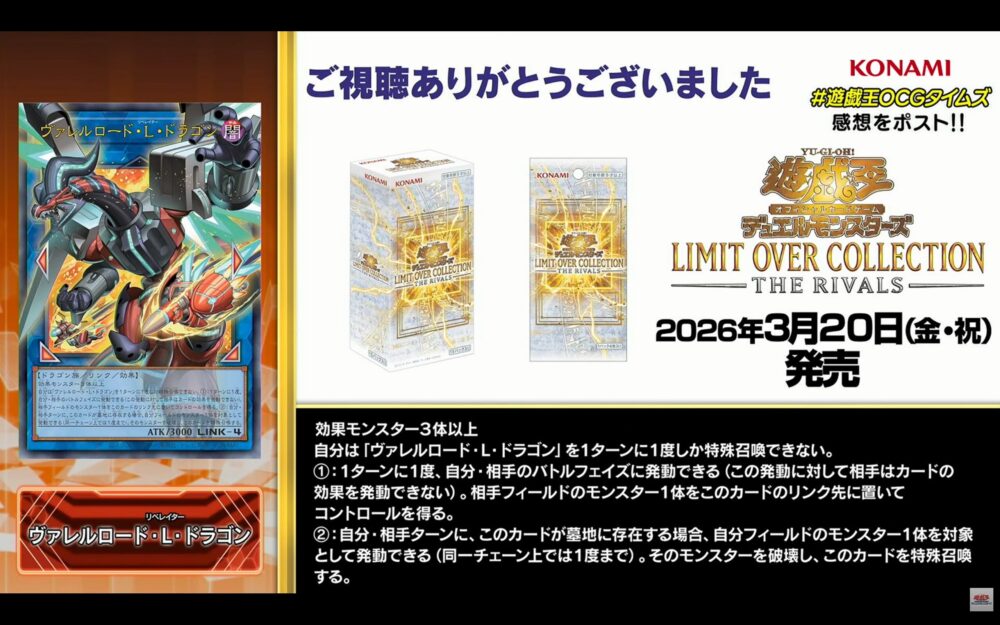 2026/3/20に発売される遊戯王OCGのスペシャルパック「リミットオーバーコレクション-THE RIVALS-(LIMIT OVER COLLECTION)」に収録される、リメイクカード6種が公開されました。